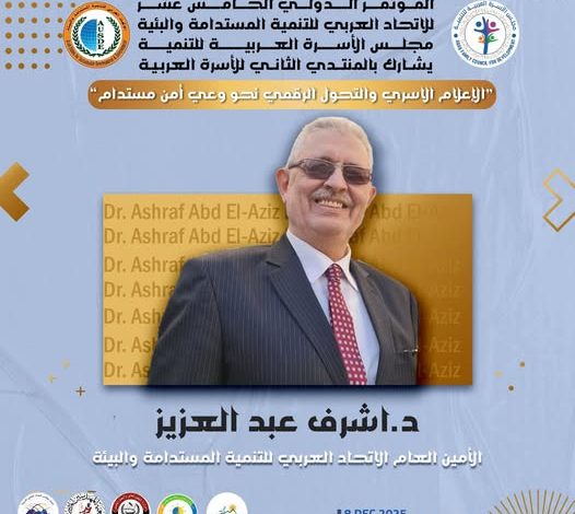 مجلس الأسرة العربية للتنمية يكرم بكل الامتنان والتقدير، معالي الدكتور أشرف عبد العزيز الأمين العام للاتحاد العربي للتنمية المستدامة والبيئة جائزة إنجاز العمر، وهي جائزة لا تُمنح إلا لمن لديهم بصمة متميزة ، وأثرًا يتجاوز حدود المؤسسات ليصل إلى وجدان المجتمعات العربية.